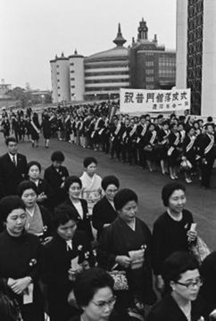 普門館落成式 落成式会場へ向かうため波羅蜜橋を渡る会員